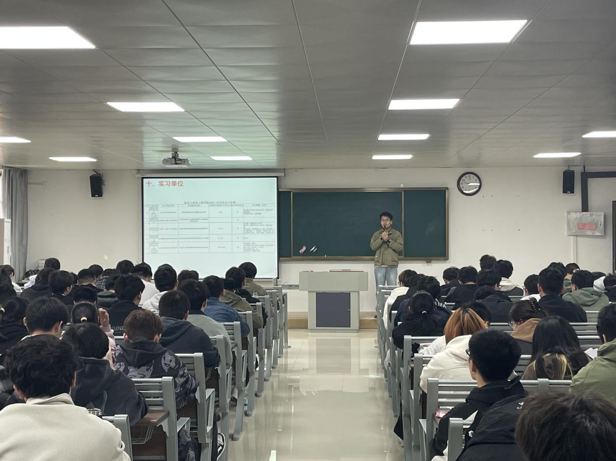 辅导员刘鸿飞老师向同学们介绍了学院合作的实习基地情况,重点讲解了各实习单位的基本福利待遇、工作内容安排以及食宿条件等。他鼓励同学们要珍惜实习机会,在实践中提升专业技能。