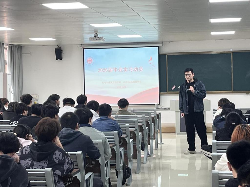 近期,beat365会员官方网站在一教320召开2026届毕业生实习动员大会,院长助理陈家乐、就业实习指导老师、毕业班辅导员及2022级自动化专业、2022级机械设计制造及其自动化专业全体学生等参加了动员大会。本次动员大会由自动化教研室主任朱鑫磊老师主持,围绕毕业实习的整体安排、具体要求及注意事项进行了全面讲解。