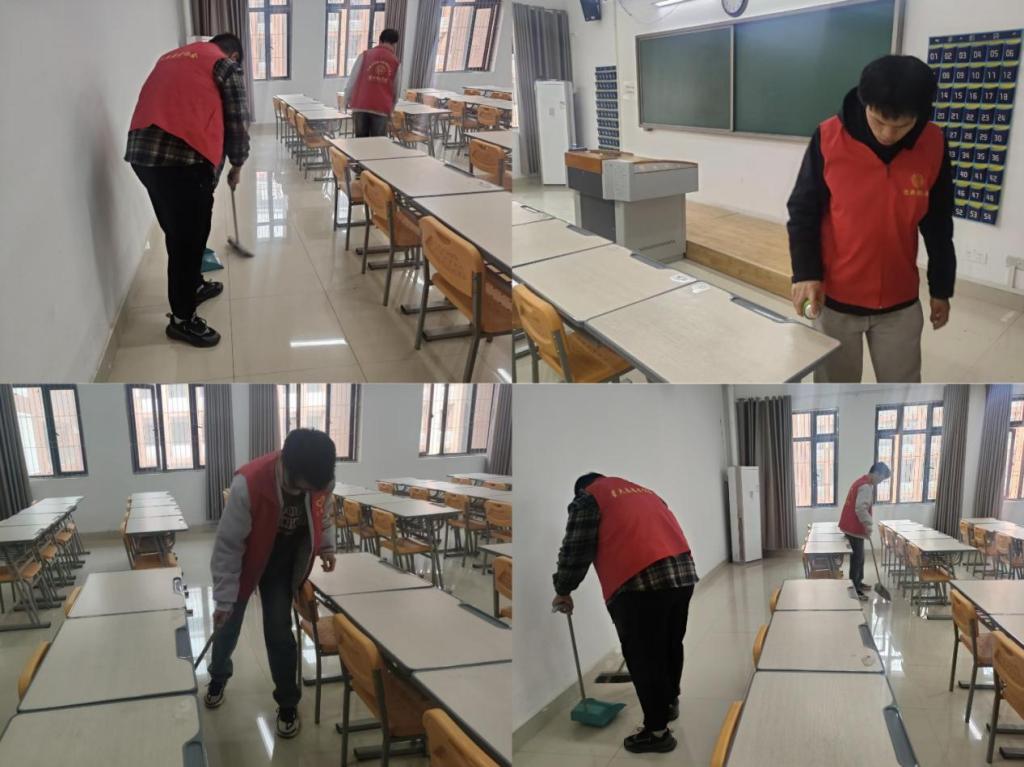 活动当日,班级学生在各班长的带领下,分工明确,迅速投入到清洁工作中。教室、走廊等教学楼各个角落,都能看到同学们忙碌的身影。大家手持扫帚、抹布、垃圾袋等清洁工具,认真清扫地面垃圾,擦拭门窗桌椅,清理卫生死角。同学们充分展现了不怕脏、不怕累的精神风貌。他们积极协作,相互配合,不放过任何一个细节,经过几个小时的辛勤劳动使校园环境焕然一新。