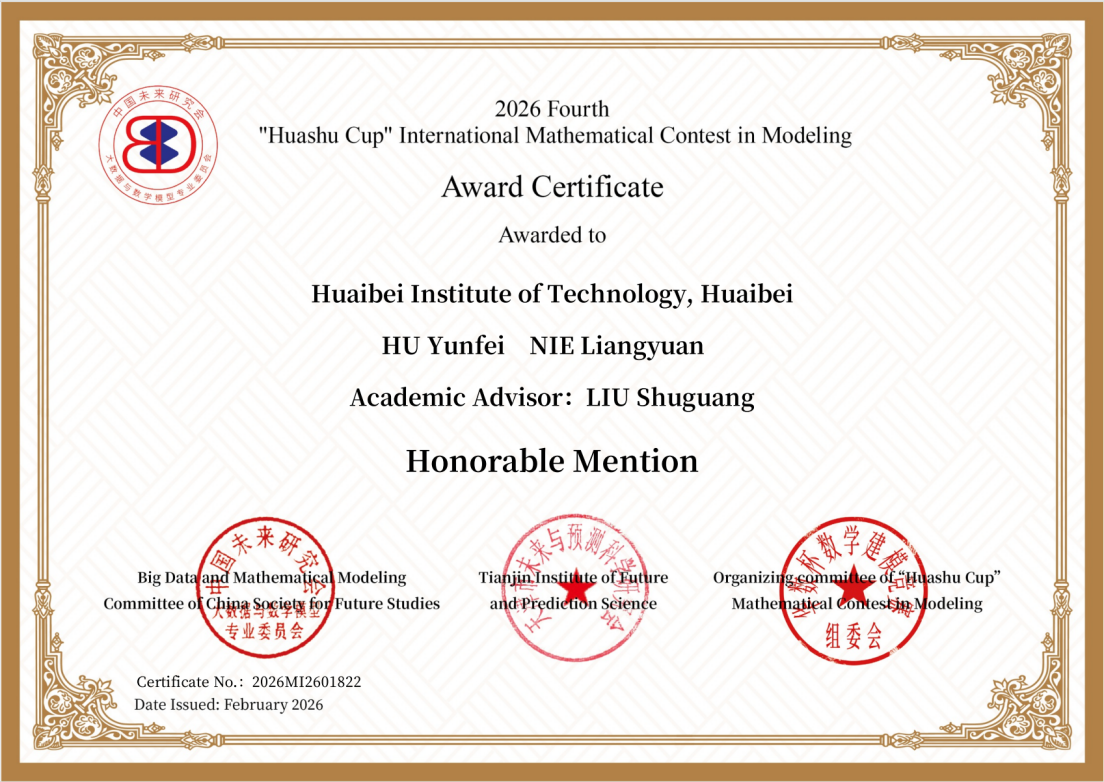 近日,2026 年第四届 “华数杯” 国际大学生数学建模竞赛官方获奖名单重磅揭晓。beat365会员官方网站beat365会员官方网站胡云飞、聂梁媛组成的惊鸿代表队,在刘曙光教授的悉心指导下,凭借过硬的专业素养与高效的团队协作,从全球 495 所高校的 1400 支参赛队伍中脱颖而出,斩获 Honorable Mention 奖(国际二等奖),为学校赢得国际赛事荣誉。